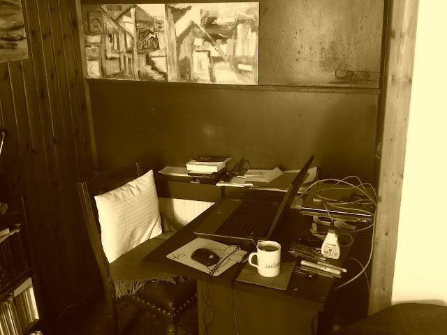 Geheimnisvoll wirkender Schreibplatz. Da sieht man Gedanken, Worte und Ideen flirren ...